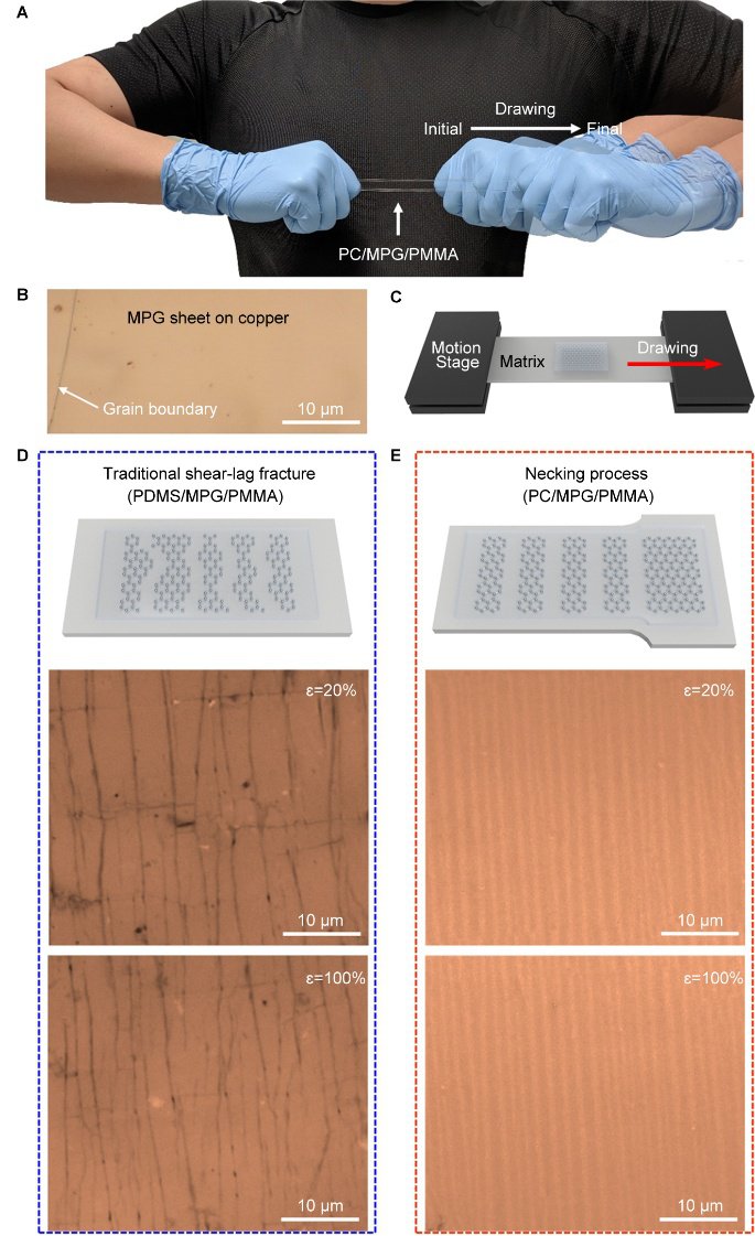 基于以上想法,團(tuán)隊(duì)聯(lián)想到了在熱塑性聚合物加工領(lǐng)域的頸縮工藝。該頸縮工藝是指在外加拉應(yīng)力作用下,熱塑性聚合物發(fā)生局部的頸縮現(xiàn)象,這種局部頸縮會(huì)在持續(xù)的拉應(yīng)力作用下移動(dòng),且伴有強(qiáng)烈的局域應(yīng)變,使得頸縮經(jīng)過(guò)的部分寬度和厚度減小,長(zhǎng)度延長(zhǎng),最終擴(kuò)展到整層聚合物。受此過(guò)程中動(dòng)態(tài)傳播的局域應(yīng)變的啟發(fā),團(tuán)隊(duì)設(shè)計(jì)了一種三明治結(jié)構(gòu)的單層多晶石墨烯及聚合物的復(fù)合體-聚碳酸酯/多晶石墨烯/聚甲基丙烯酸甲酯-并對(duì)其進(jìn)行了簡(jiǎn)便的頸縮工藝處理,最終觀察到了一個(gè)非常有趣的現(xiàn)象:在頸縮未經(jīng)過(guò)的部分,石墨烯保持原貌;在頸縮經(jīng)過(guò)之后,石墨烯斷裂成有序且寬度一致的納米尺寸條帶。在整個(gè)過(guò)程中,石墨烯的斷裂伴隨著頸縮的傳播而有序的發(fā)生。