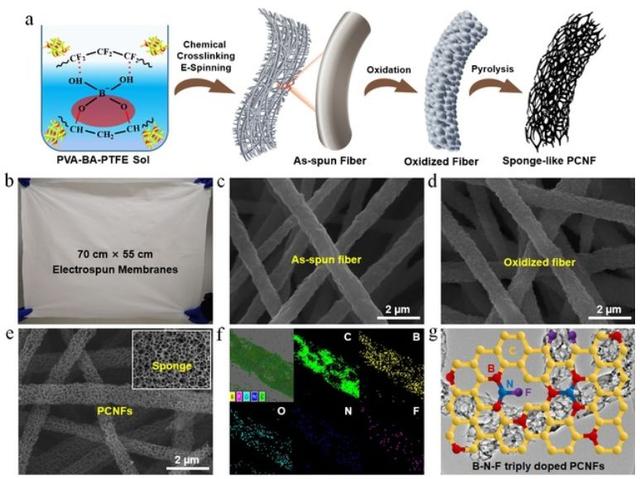 圖1. B-N-F三元摻雜的通體多孔碳納米纖維的制備與表征。(a)使用化學(xué)交聯(lián)靜電紡絲和高溫煅燒法合成多孔碳納米纖維的示意圖;(b)前驅(qū)體纖維膜;(c-e)依次為前驅(qū)體纖維,預(yù)氧化纖維和多孔碳納米纖維的掃描電子顯微鏡圖;(f)多孔碳納米纖維的EDS譜圖;(g)B-N-F摻雜的碳納米纖維結(jié)構(gòu)模型。