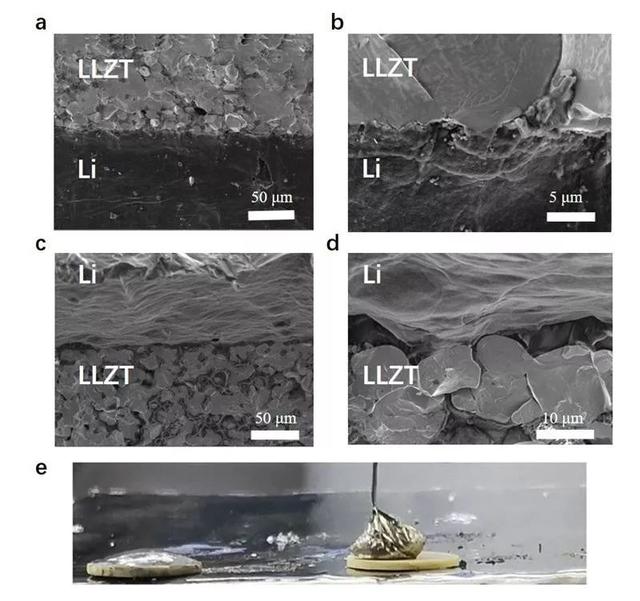 圖一(a-b)經(jīng)過表面處理之后的LLZO/Li的界面電鏡圖;(c-d)未經(jīng)過任何處理的LLZO/Li界面電鏡圖;(e)兩種不同方法下潤濕狀態(tài)實物對比圖。