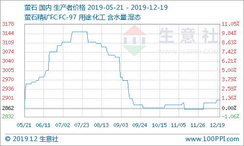 中國(guó)粉體網(wǎng)訊 12月19日螢石商品指數(shù)為101.56,與昨日持平,較周期內(nèi)最高點(diǎn)127.49點(diǎn)(2019-01-03)下降了20.34%,較2016年12月18日最低點(diǎn)49.21點(diǎn)上漲了106.38%。(注:周期指2011-09-01至今)