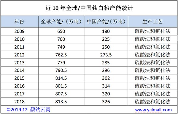 2019年是中國鈦白粉工業(yè)誕生64周年,但鈦白粉工業(yè)實質(zhì)性的發(fā)展是從1998年起始。據(jù)國家化工行業(yè)生產(chǎn)力促進中心鈦白分中心和顏鈦云商初步統(tǒng)計,20多年來,行業(yè)總產(chǎn)能由1998年的19.8萬噸/年,增加到2018年的326萬噸/年,年均增長率高達15%以上;全行業(yè)的總產(chǎn)量由1998年的14萬噸,增加到2018年的295.38萬噸,年均增長率也高達16%以上。
