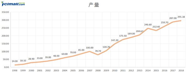 1998-2018年中國鈦白粉產(chǎn)量走勢圖