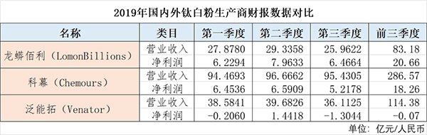 根據(jù)現(xiàn)有已公開的數(shù)據(jù)顯示,龍蟒佰利(002601)2019一季報凈利潤6.23億元,同比2018年一季度的5.98億元增長了4.18%。而反觀2019年5月2日科慕(Chemours)公告,2019年前三個月鈦白粉銷量大幅下降,銷售額為5.55億美元,而2018年第一季度為8.54億美元,同比下降35.01%,2018年第四季度為6.66億美元,環(huán)比下降16.67%。