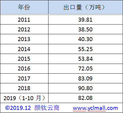 顏鈦云商報道:根據(jù)海關(guān)總署提供統(tǒng)計數(shù)據(jù),2019年10月我國鈦白粉出口量為7.94萬噸,環(huán)比減少5.26%,同比增加26.08%。2019年1-10月鈦白粉累計出口量為82.08萬噸,同比增加5.82%。預(yù)計2019年全年出口總量或空前的破百萬噸,這更是說明中國鈦白粉越來越多的受到全球范圍的認可,越來越多領(lǐng)域出現(xiàn)中國制造的鈦白粉。