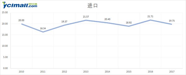 2010-2017年中國鈦白粉進口量走勢圖(單位:萬噸)