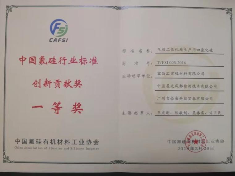 2019年2月26日,在中國氟硅有機(jī)材料工業(yè)協(xié)會(huì)2019年首屆行業(yè)標(biāo)準(zhǔn)大會(huì)及團(tuán)體標(biāo)準(zhǔn)審查會(huì)上,以宜昌匯富硅材料有限公司為第一起草單位的團(tuán)體標(biāo)準(zhǔn)《氣相二氧化硅生產(chǎn)用四氯化硅》(T/FSI003-2016)獲得首屆中國氟硅行業(yè)標(biāo)準(zhǔn)創(chuàng)新貢獻(xiàn)獎(jiǎng)一等獎(jiǎng)。