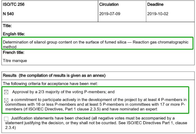 《氣相納米二氧化硅表面硅羥基含量測(cè)定方法》國際標(biāo)準(zhǔn)立項(xiàng)結(jié)果截圖