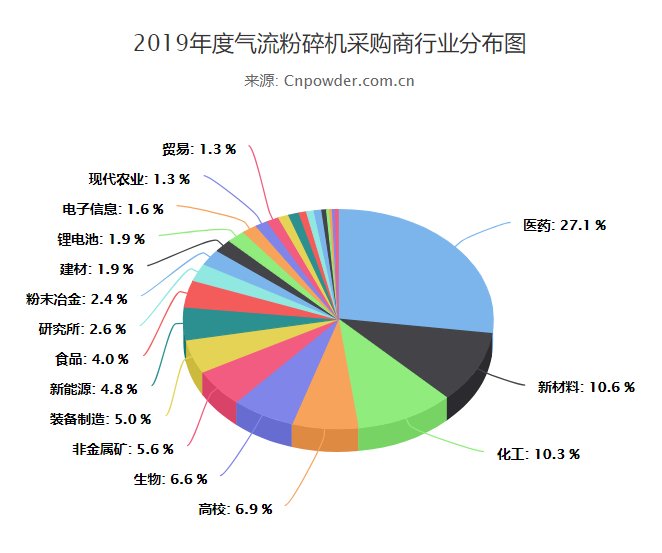 2019年氣流粉碎機市場醫(yī)藥領(lǐng)域采購率持續(xù)領(lǐng)先,小編通過對比2018年數(shù)據(jù)分析發(fā)現(xiàn),醫(yī)藥、新材料、化工行業(yè)氣流粉碎機的市場采購率還是有增不減。另外,小編發(fā)現(xiàn),2019年氣流粉碎機在非金屬、裝備制造、食品等行業(yè)的設(shè)備采購率大大增加,分別從2.7%、1.7%、2.3%增長至5.6%、5.0%和4.0%。
