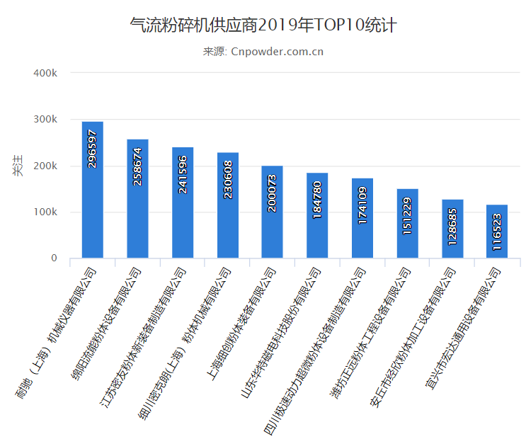 從2018年的數(shù)據(jù)發(fā)現(xiàn),除了耐馳(上海)機械儀器有限公司之外,剩下的企業(yè)之間差距不大,但從2019年的數(shù)據(jù)中可以發(fā)現(xiàn),相鄰企業(yè)的差距微乎其微,并且2019年的關(guān)注度比去年還有所增加。有些企業(yè)進入氣流粉碎機供應商2019年TOP10,有些則被排出。當然,我們也不能以偏概全,有些未上榜企業(yè)做得也是很不錯的,數(shù)據(jù)背后呈現(xiàn)的是激烈的市場競爭以及企業(yè)生存發(fā)展不為人知的艱辛。最后,希望所有企業(yè)每年都能夠百尺竿頭更進一步!