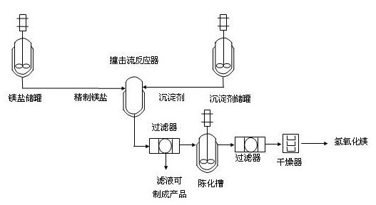 張麗等采用撞擊流反應(yīng)器,在撞擊流反應(yīng)器中,鎂鹽與沉淀劑在20~90℃下發(fā)生反應(yīng),生成氫氧化鎂沉淀,所得沉淀在50~120℃下陳化1~10小時(shí),再經(jīng)過(guò)濾、烘干,最終得到氫氧化鎂產(chǎn)品。