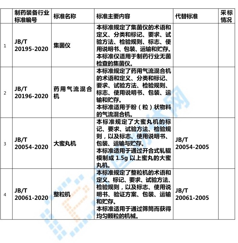 以下是4項制藥裝備行業(yè)標(biāo)準(zhǔn)的制修訂公示。其中,制訂的藥用氣流混合機行業(yè)標(biāo)準(zhǔn)規(guī)定了藥用氣流混合機的術(shù)語和定義、分類和標(biāo)記、要求、試驗方法、檢驗規(guī)則、標(biāo)志、使用說明書、包裝、運輸和貯存。本標(biāo)準(zhǔn)適用于粉(粒)狀物料的氣流混合機。據(jù)中國粉體網(wǎng)小編的了解,藥用氣流混合機行業(yè)標(biāo)準(zhǔn)的起草單位是北京長峰金鼎科技有限公司。