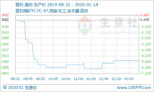 中國粉體網(wǎng)訊 1月14日螢石商品指數(shù)為101.56,與昨日持平,較周期內(nèi)最高點(diǎn)127.49點(diǎn)(2019-01-03)下降了20.34%,較2016年12月18日最低點(diǎn)49.21點(diǎn)上漲了106.38%。(注:周期指2011-09-01至今)