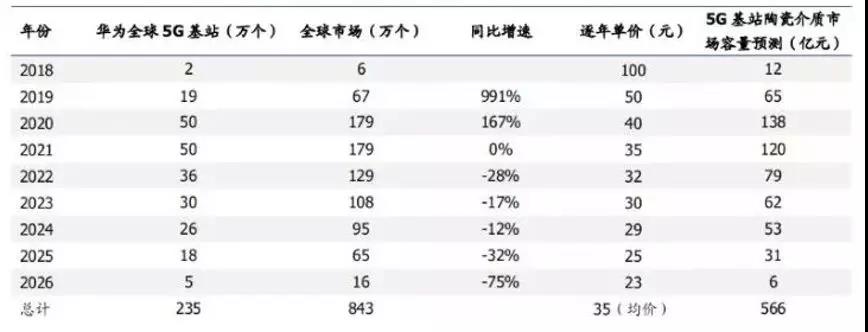 目前,全球四大通信設(shè)備商中,華為和愛立信傾向于陶瓷介質(zhì)濾波器,中興和諾基亞目前仍以小型化金屬腔體濾波器為主,陶瓷介質(zhì)濾波器處于供不應(yīng)求的階段。研究機(jī)構(gòu)預(yù)測(cè),5G時(shí)代全球基站數(shù)將近850萬(wàn)臺(tái),按每個(gè)基站3面天線,每面天線64個(gè)濾波器估算,介質(zhì)濾波器需求16億只,陶瓷介質(zhì)濾波器全球市場(chǎng)容量約566億元。