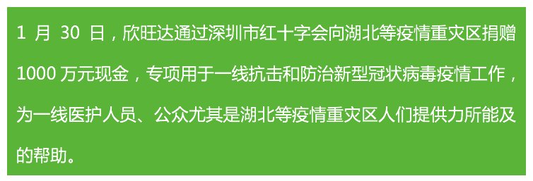 1月30日,欣旺達(dá)通過(guò)深圳市紅十字會(huì)向湖北等疫情重災(zāi)區(qū)捐贈(zèng)1000萬(wàn)元現(xiàn)金,專項(xiàng)用于一線抗擊和防治新型冠狀病毒疫情工作,為一線醫(yī)護(hù)人員、公眾尤其是湖北等疫情重災(zāi)區(qū)人們提供力所能及的幫助。