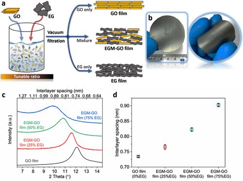 圖2. 片層間距可調(diào)節(jié)的復(fù)合石墨烯薄膜的結(jié)構(gòu)表征