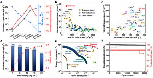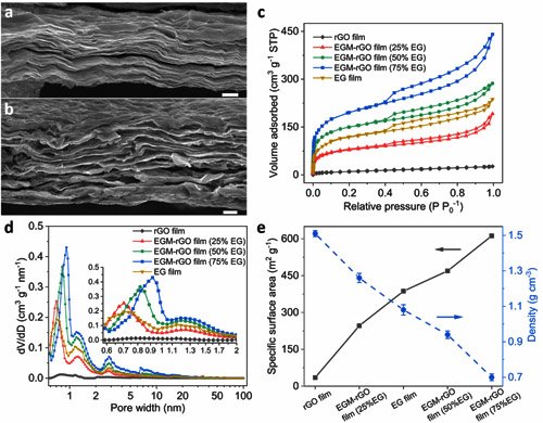 中國粉體網(wǎng)訊 電化學(xué)電容器具有可快速充電、功率高、循環(huán)壽命長、工作溫度范圍寬、安全性能高等優(yōu)點,可用作大功率電源,在混合電動汽車、備用電源、便攜式電子設(shè)備等領(lǐng)域都具有廣闊的發(fā)展前景。然而電化學(xué)電容器相比于電池其能量密度較低,即單位體積內(nèi)儲存的能量低,限制了其更廣泛的應(yīng)用范圍,尤其是在便攜式智能設(shè)備中的應(yīng)用, 需要進一步提高體積能量密度。近日,中國科學(xué)院金屬研究所與英國倫敦大學(xué)學(xué)院合作,在《自然-能源》(Nature Energy) 在線發(fā)表題為《可調(diào)層間距、高效孔利用石墨烯薄膜的電化學(xué)電容儲能研究》(Tuning the interlayer spacing of graphene laminate films for efficient pore-utilization towards compact capacitive energy storage)的研究論文。