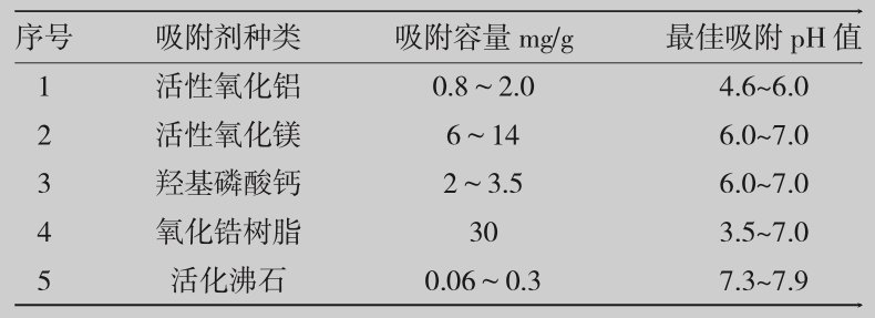 由表可知,活化沸石和活性氧化鋁的吸附容量都較小,羥基磷酸鈣對(duì)氟的吸附容量最高可達(dá)3.5mg/g,而用稀土氧化鋯為主制得的氧化鋯樹(shù)脂吸附容量最高可達(dá)30mg/g,但它們價(jià)格昂貴,且其對(duì)廢水pH值的適應(yīng)范圍較小。