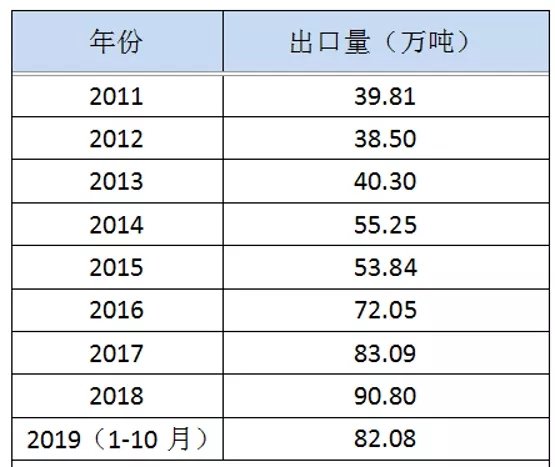 國內(nèi)鈦白粉價格優(yōu)勢明顯,出口多以低端硫酸法為主。國外鈦白粉巨頭多使用氯化法生產(chǎn)鈦白粉,國內(nèi)出口的鈦白粉多是硫酸法生產(chǎn)的銳鈦型鈦白粉,售價要遠低于國外。我國鈦白粉出口總量大體呈逐年遞增態(tài)勢,2018年的出口量更高達90.80萬噸,占當年全國總產(chǎn)量的30.73%。2019年10月我國鈦白粉出口量為7.94萬噸,環(huán)比減少5.26%,同比增加26.08%。2019年1-10月鈦白粉累計出口量為82.08萬噸,同比增加5.82%。預計2019年全年出口總量或空前的破百萬噸。