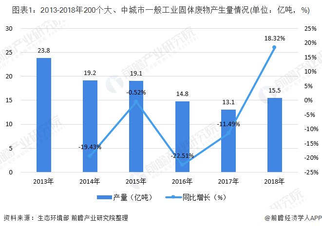 根據(jù)生態(tài)環(huán)境部發(fā)布的《2019年全國(guó)大、中城市固體廢物污染環(huán)境防治年報(bào)》,2018年,200個(gè)大、中城市一般工業(yè)固體廢物產(chǎn)生量達(dá)15.5億噸,較2017年產(chǎn)量同比增長(zhǎng)18.32%。