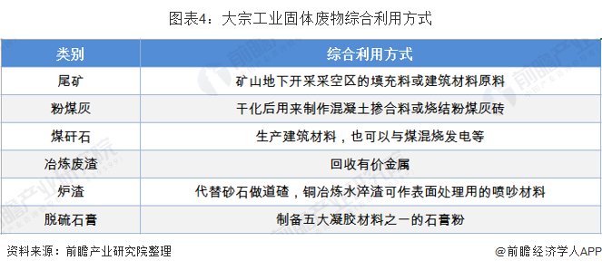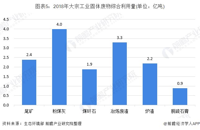 根據(jù)生態(tài)環(huán)境部統(tǒng)計(jì)數(shù)據(jù),2018年大宗工業(yè)固體廢物綜合利用量分別為尾礦2.4億噸、粉煤灰4.0億噸、煤矸石1.9億噸、冶煉廢渣3.3億噸、爐渣2.2億噸、脫硫石膏0.9億噸。