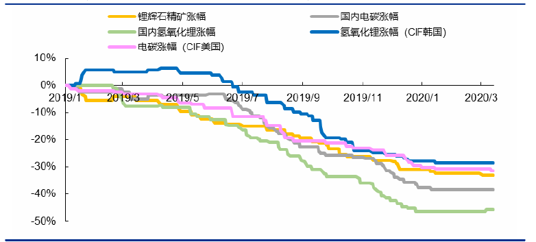 2019年以來各類鋰鹽價(jià)格定基漲幅(2019年1月1日為基期)
