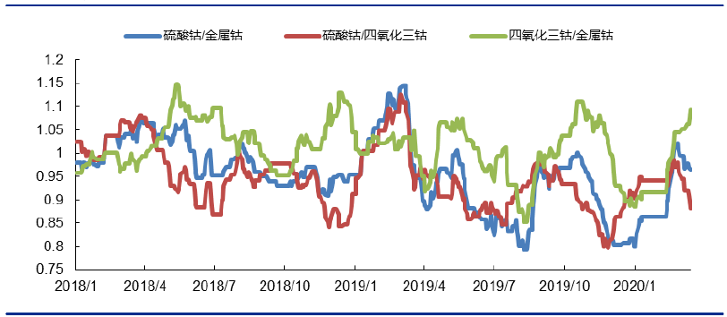 鈷產(chǎn)品比價(jià)關(guān)系變化(按鈷含量折金屬鈷)