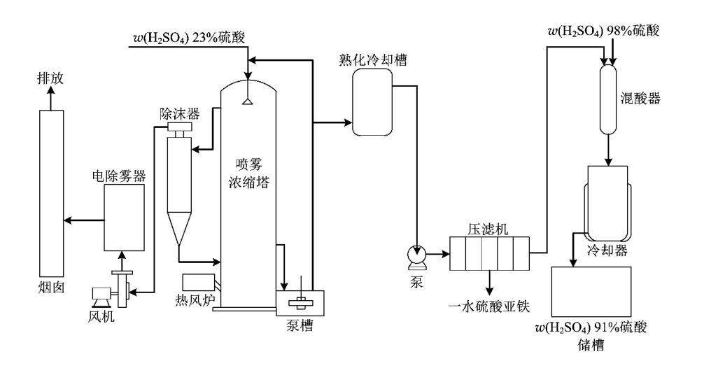 由鈦白粉生產(chǎn)產(chǎn)生的低濃度廢硫酸送入噴霧濃縮塔內(nèi),與熱風(fēng)爐燃燒燃料產(chǎn)生的高溫?zé)犸L(fēng)進(jìn)行逆流接觸,蒸發(fā)出廢硫酸中的水分。