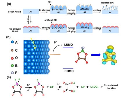 (a)通過同步預合金化以及構筑人造SEI膜提高鋁負極循環(huán)穩(wěn)定性的機制;(b)DFOB-在鋁負極表面的還原機制以及DFOB-接受電子后的電荷差分圖;(c)DFOB-通過開環(huán)反應進行還原和聚合的機制