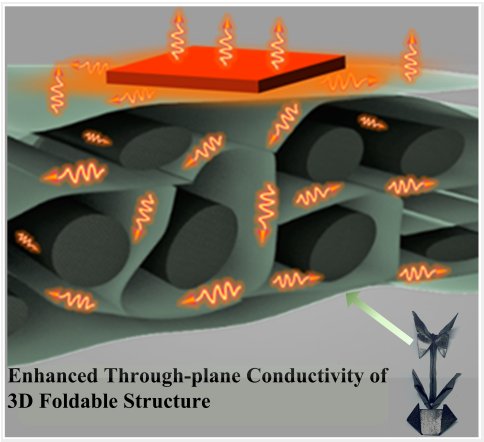 加拿大滑鐵盧大學(xué)的陳忠偉教授與湖南大學(xué)陳小華教授課題組通過(guò)構(gòu)建3D互穿石墨烯通道,制備了在面內(nèi)方向和厚度方向均具有高熱導(dǎo)率的柔性可折疊碳膜。以超細(xì)高分子纖維為骨架,氧化石墨烯作為成膜物質(zhì),通過(guò)相互之間的鍵合作用,同時(shí)借助高溫處理,形成3D互連的微鉸鏈狀結(jié)構(gòu),石墨烯互穿于纖維表面獲得連續(xù)的一體化全碳復(fù)合薄膜。