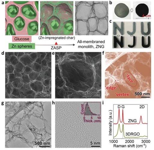 圖1. 三維石墨烯ZnG的合成方法、結(jié)構(gòu)、形態(tài)和拉曼光譜分析。a-c) 合成過(guò)程及光學(xué)照片;d-g) SEM、STEM、TEM圖片;h)單個(gè)泡孔孔壁——石墨烯膜的HRTEM圖;i) 拉曼光譜。