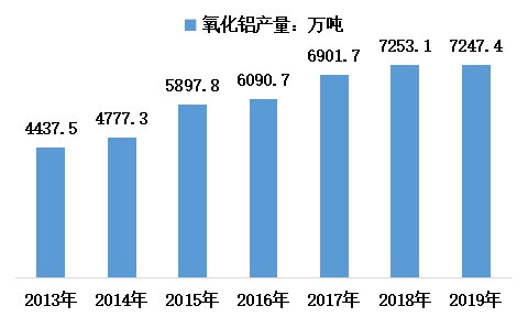 2013-2019年中國(guó)氧化鋁產(chǎn)量統(tǒng)計(jì)