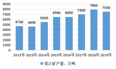 近幾年鋁土礦的國(guó)內(nèi)供應(yīng)情況又是日益窘迫,除了環(huán)保督查、礦山整頓、礦業(yè)權(quán)出讓制度改革等的政策限制,我國(guó)鋁土礦產(chǎn)量受到一定影響。2019年我國(guó)鋁土礦產(chǎn)量下降至7500萬(wàn)噸,相比2018年減少約400萬(wàn)噸。
