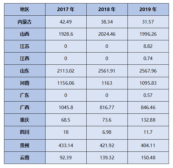 2017-2019年中國(guó)主要城市氧化鋁產(chǎn)量 單位:萬(wàn)噸