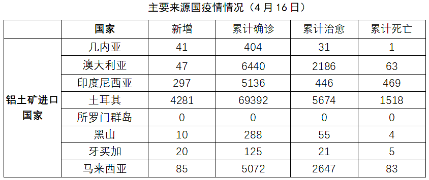 中國主要的鋁土礦進口國中,澳大利亞、印度尼西亞、土耳其和馬來西亞新冠肺炎確診人數(shù)在5000以上,以土耳其超過5萬人。幾內(nèi)亞、所羅門群島、黑山共和國和牙買加等國疫情較輕,人數(shù)低于500人。