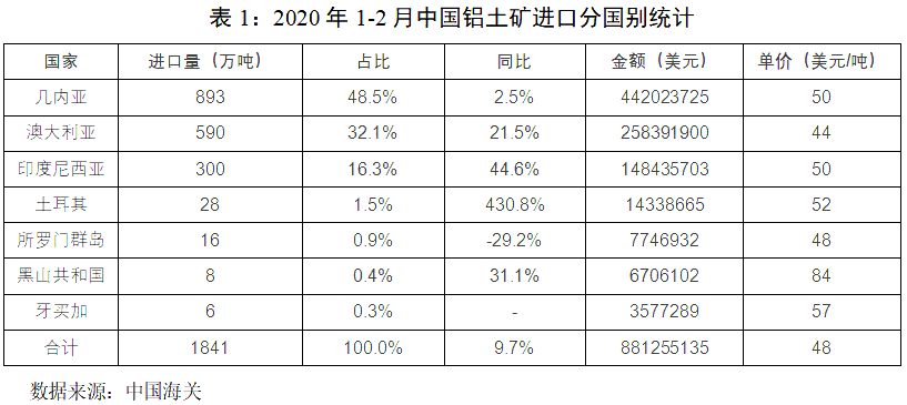 2014年,曾經(jīng)是中國鋁土礦進口第 一大來源國的印度尼西亞開始實施禁止鋁土礦出口的政策,中國開始加快拓展進口來源,同時加大海外鋁土礦資源開發(fā)。目前,中國鋁土礦進口形成了以幾內(nèi)亞、澳大利亞和印度尼西亞為主的格局,2020年前兩個月中國自該三國的鋁土礦進口量占總進口量的比重超過95%;同時,來自海外自有或者權(quán)益礦山的比重也在持續(xù)增加,改變了以往單純貿(mào)易進口的局面,主動權(quán)大幅提升。