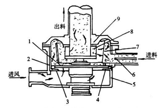 1-粉碎盤;2-齒板;3-錘頭;4-擋風(fēng)盤;5-機(jī)殼;6-加料螺旋;7-導(dǎo)向圈;8-分級(jí)葉輪;9-機(jī)蓋