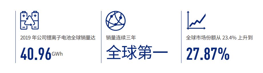 報告顯示,2019年,公司鋰離子電池全球銷量達40.96GWh,其中動力電池系統(tǒng)全球銷量達40.25GWh。2019年公司動力電池銷量排名繼續(xù)保持全球第一,全球市場份額從23.4%上升到27.87%。