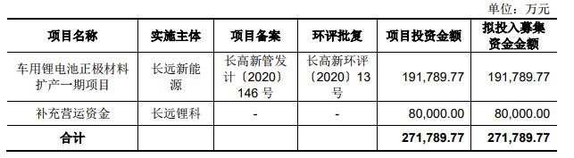 募資用途方面,長遠(yuǎn)鋰科表示本次募集資金扣除發(fā)行費(fèi)用后,將用于“車用鋰電池正極材料擴(kuò)產(chǎn)一期項(xiàng)目”及補(bǔ)充營運(yùn)資金,共計(jì)27.18億元。其中,車用鋰電池正極材料擴(kuò)產(chǎn)一期項(xiàng)目建設(shè)投資19.18億元,將建成年產(chǎn)4萬噸車用鋰電三元正極材料生產(chǎn)線。詳情如下: