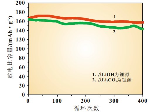 根據(jù)汪永斌等的實(shí)驗(yàn)結(jié)果表明:采用碳酸鋰制備的三元材料,首次放電比容量達(dá)到165mAh/g,400次循環(huán),容量保持率達(dá)到86%左右,而采用氫氧化鋰所制備的三元材料,首次放電比容量達(dá)到171mAh/g,400次循環(huán),容量保持率達(dá)到91%。從整個(gè)循環(huán)過程來看,以氫氧化鋰為鋰源的材料循環(huán)曲線更為平滑穩(wěn)定;以碳酸鋰為鋰源的材料約350次循環(huán)后容量衰減逐漸加快。