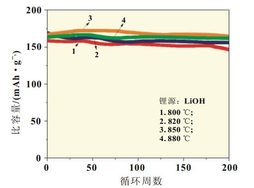 研究表明以氫氧化鋰為鋰源時(shí),只需低溫?zé)Y(jié)就可以得到性能優(yōu)異的材料;而以碳酸鋰為鋰源時(shí),燒結(jié)溫度要達(dá)到900℃以上,才能得到性能穩(wěn)定的材料。隨著循環(huán)次數(shù)增加,以氫氧化鋰為鋰源所制備的材料循環(huán)曲線更加平滑,充放電性能更加穩(wěn)定。