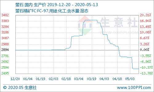 中國粉體網(wǎng)訊 由螢石價(jià)格走勢(shì)圖清晰看出螢石價(jià)格走勢(shì)維持低位,據(jù)統(tǒng)計(jì)截止5月13日國內(nèi)螢石均價(jià)為2577.78元/噸,國內(nèi)螢石價(jià)格維持低位,據(jù)統(tǒng)計(jì)近期國內(nèi)內(nèi)蒙古地區(qū)97螢石濕粉價(jià)格在2400-2700元/噸,福建地區(qū)97螢石濕粉商談主流在2500-2900元/噸,河南地區(qū)97螢石濕粉價(jià)格在2500-2900元/噸,江西地區(qū)97螢石濕粉價(jià)格在2500-3000元/噸。