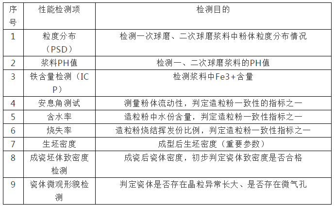 半成品/過程檢測主要包括一次球磨漿料、預(yù)燒粉、二次球磨漿料的物理性能檢測。其主要檢測項(xiàng)包括:一次球磨粒度分布、二次球磨粒度分布、漿料PH值檢測、鐵含量檢測、造粒粉安息角、含水率、燒失率檢測、成型后生坯密度檢測、生坯燒結(jié)成瓷后收縮率、致密度檢測、瓷體微觀形貌檢測。