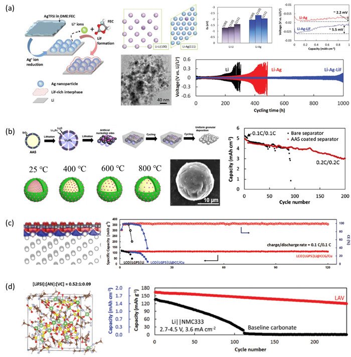 圖1 基于(a)銀-氟化鋰人工界面,(b)富LixAl位點(diǎn)鋁基宿主結(jié)構(gòu)和(c)少層石墨烯-三維儲(chǔ)鋰結(jié)構(gòu)的鋰金屬負(fù)極保護(hù);(d)對(duì)鋰穩(wěn)定的新型腈類電解液