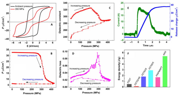 AKN鐵電陶瓷的宏觀性能:(A)AKN壓力下的P-E曲線,(B)等靜壓下原位去極化曲線,(C和D)等靜壓下介電常數(shù)和介電損耗,(E)在6.9GPa沖擊壓力下的動態(tài)放電曲線,(F)與其他鐵電材料的儲能密度比較。