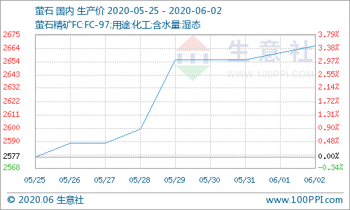 中國粉體網(wǎng)訊 據(jù)生意社監(jiān)測顯示國內(nèi)螢石價格上漲,自5月25日開始結(jié)束了2個月以來的下跌行情,螢石價格從5月25日2577.78元/噸上漲至6月2日的2666.67元/噸,漲幅為3.45%。
