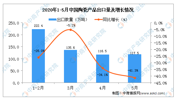 中國(guó)粉體網(wǎng)訊 據(jù)中商產(chǎn)業(yè)研究院數(shù)據(jù)庫顯示,2020年5月中國(guó)陶瓷產(chǎn)品出口量下降,2020年5月中國(guó)陶瓷產(chǎn)品出口量為117.5萬噸,同比下降41.3%。