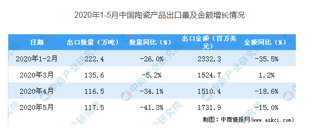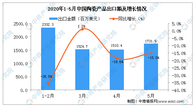 從金額方面來看,2020年5月中國(guó)陶瓷產(chǎn)品出口金額為1731.9百萬美元,同比下降15%。