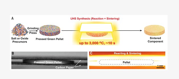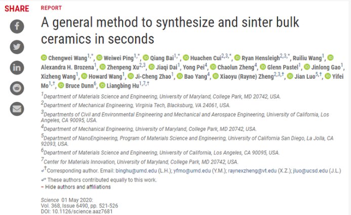 近日,美國馬里蘭大學(xué)胡良兵團(tuán)隊(duì)在Science 在線發(fā)表題為“A general method to synthesize and sinter bulk ceramics in seconds”的研究論文,該研究為了提高陶瓷組分的篩選效率,從陶瓷的燒制工藝入手,作者創(chuàng)造性地開發(fā)了全新的陶瓷快速燒結(jié)技術(shù),僅用10秒左右的時(shí)間即能將陶瓷致密化,大大縮短陶瓷的制備周期。與現(xiàn)存快速燒結(jié)技術(shù)(電火花燒結(jié)、微波燒結(jié)以及光子燒結(jié)技術(shù))不同的是,該快速燒結(jié)技術(shù)具有低成本、普適性強(qiáng)以及可批量化等優(yōu)勢。特別地,該快速燒結(jié)技術(shù)能與陶瓷基3D打印領(lǐng)域進(jìn)行有機(jī)的結(jié)合,能有效地克服陶瓷基異形3D打印物件帶來的難加工等不足。