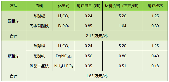 由上表我們可以清晰地看出,固相法的原料成本更高一些,主要是因?yàn)闊o(wú)水磷酸鐵的價(jià)格高,導(dǎo)致固相法原材料價(jià)格偏高。
