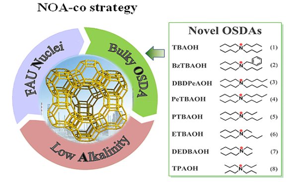 該項研究中,研究團隊提出高硅Y沸石的合成新策略(NOA-co策略),在高分散的FAU晶核溶液、較大體積的有機模板劑、低堿度的合成凝膠三者協(xié)同作用下實現(xiàn)了其直接合成;贜OA-co策略,研究團隊發(fā)現(xiàn)多種高效合成高硅Y沸石的有機模板劑,并對晶化機理進行了探討。